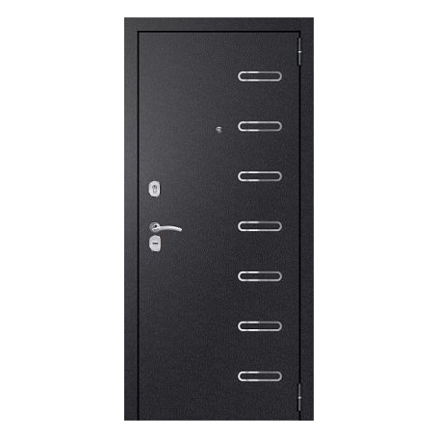 Дверное полотно, дверной короб, петли- 3 шт., противосъемные ригели - 3 шт., наличник, уплотнители -