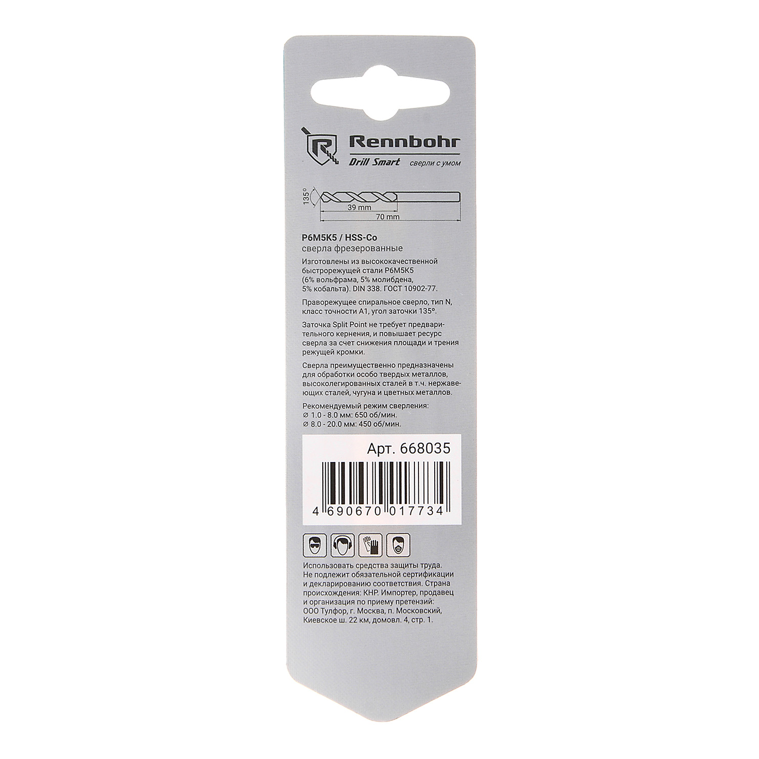 Сверло по металлу 3,50*70/39мм HSS-Co P6M5К5 (2шт) блистер арт.668035 COBALT RENNBOHR *10/40/640