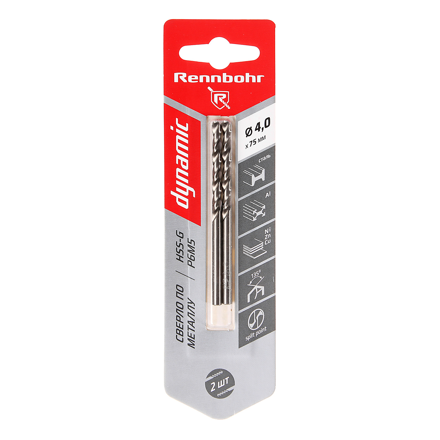 Сверло по металлу 4,00*75/43мм HSS-G P6M5 (2шт) блистер арт.675040 DYNAMIC RENNBOHR *10/40/640