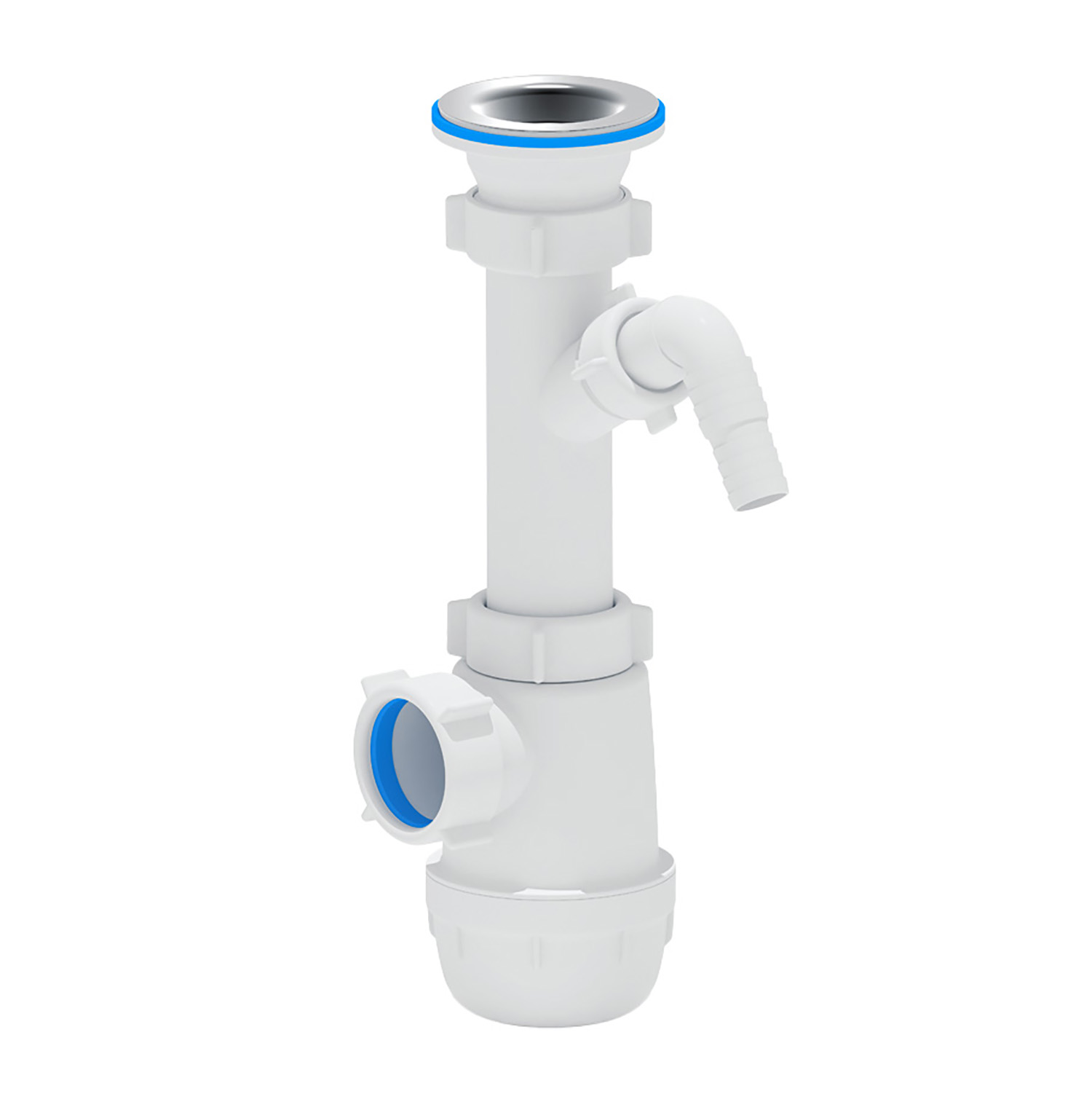 Сифон для кухонных моек с диаметром сливного отверстия 50мм, бутылочного типа с увеличенным корпусом. С разборным выпуском и нержавеющей решеткой, с отводом для подключения бытовой техники. Выход для подключения к канализации 40мм.