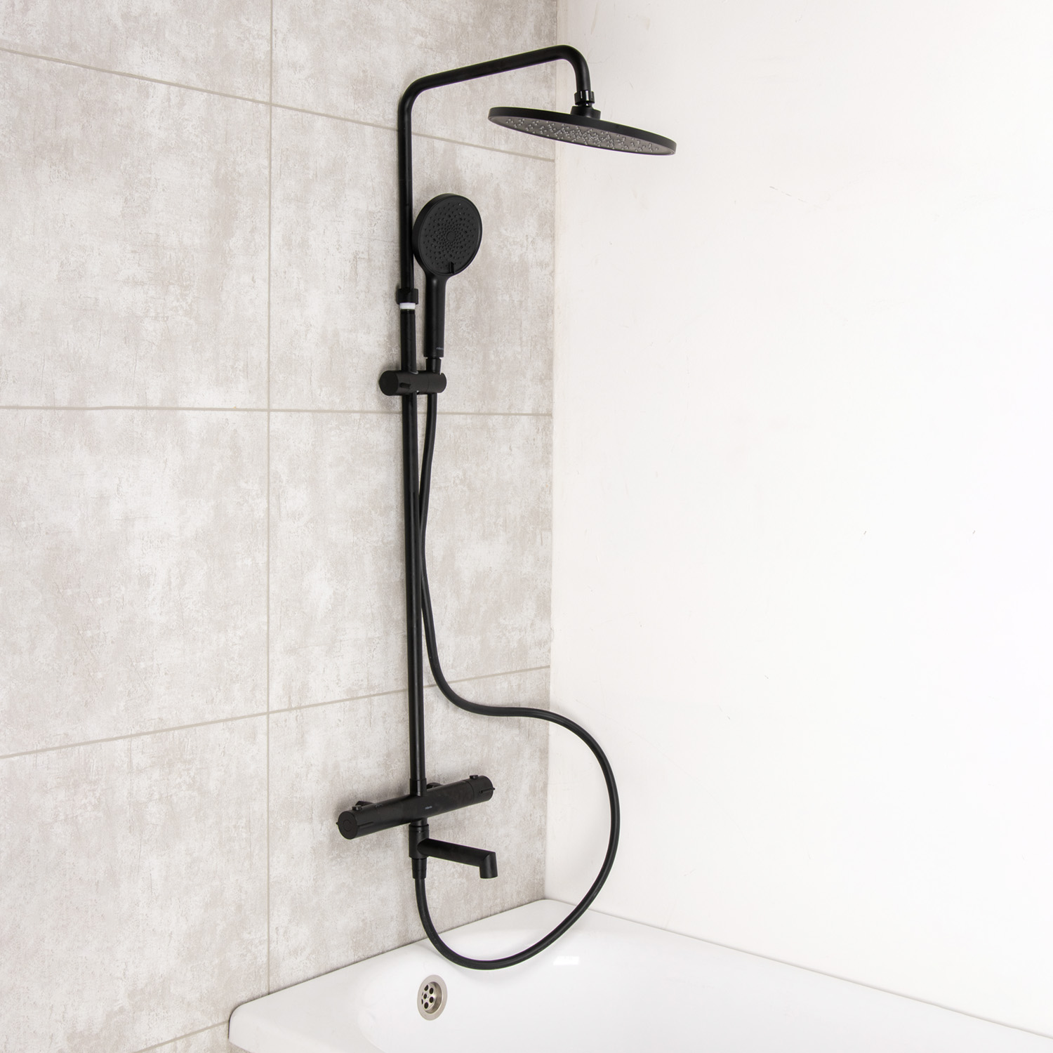 Смеситель д/ванны термостатич. со стойкой для душа+ручной и тропич.душ черный Milardo ILSBLTHM06*1/3