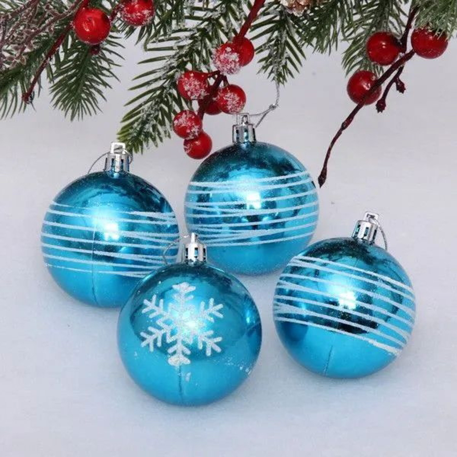 Новогодние шары 6 см (набор 4 шт) "Снежные нити", голубой/белый