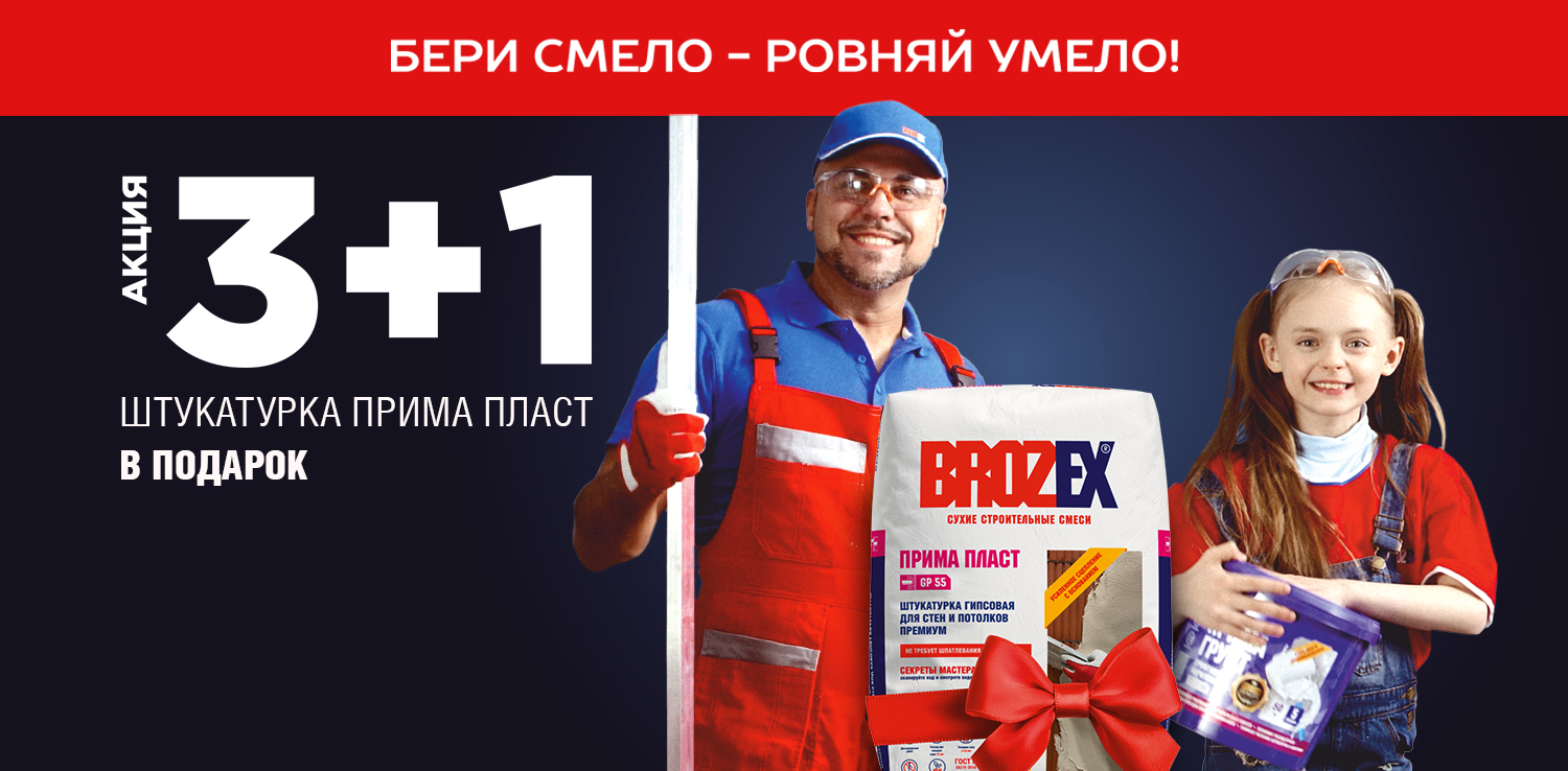 Акция 3+1 штукатурка BROZEX Прима Пласт - в подарок