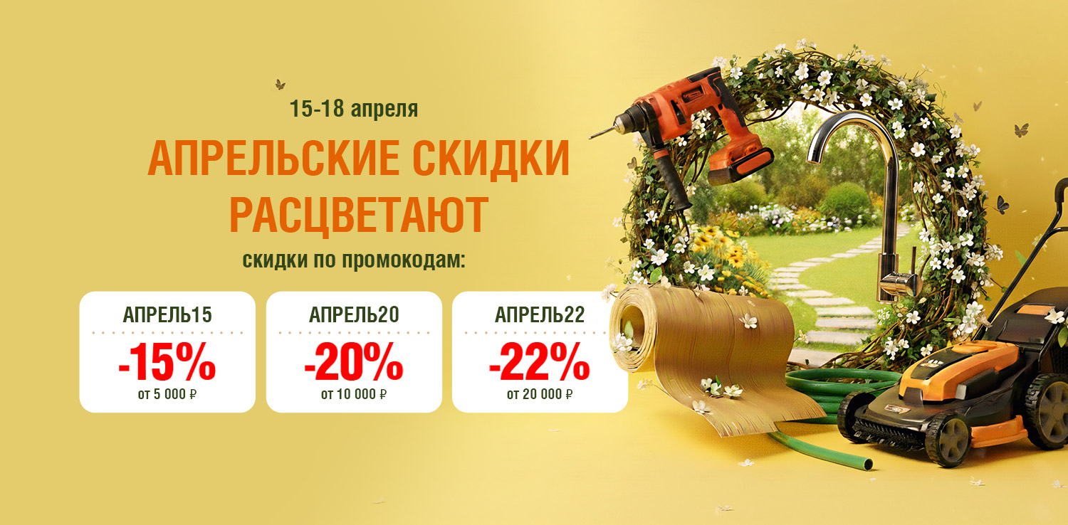 Скидка распространяется только на товары с белыми ценниками и с шильдиком «АПРЕЛЬ», не распространяется на товары с желтыми ценниками, на гр. Строительные материалы. Не суммируется с другими акциями (в том числе со скидкой по дисконтной карте, скидкой для пенсионеров и акцией для новоселов). При применении промокода списание бонусов станет недоступным. Подробности акции можно узнать у продавцов-консультантов, операторов интернет-магазина или по телефону горячей линии. Оплатить покупку акционных товаров бонусами в дни акции нельзя, но бонусы за покупки будут начисляться. Акция действует только для физических лиц.