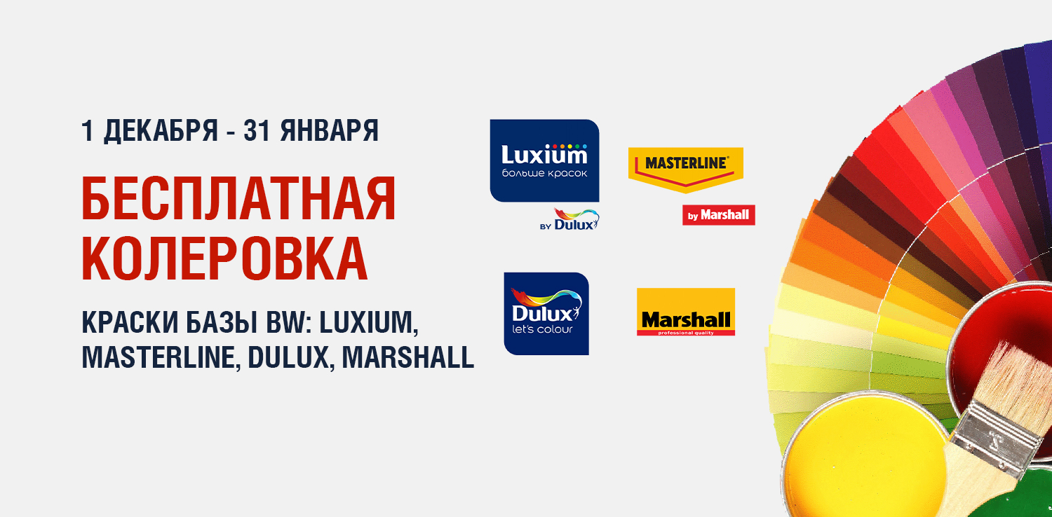 С 1 декабря 2025 по 31 января 2026 при покупке краски брендов Luxium, Masterline, Dulux, Marshall (база BW) - услуга колеровки предоставляется бесплатно. Технология компьютерной колеровки поможет вам воплотить любую дизайнерскую задумку. Просто выберите идеальный оттенок!