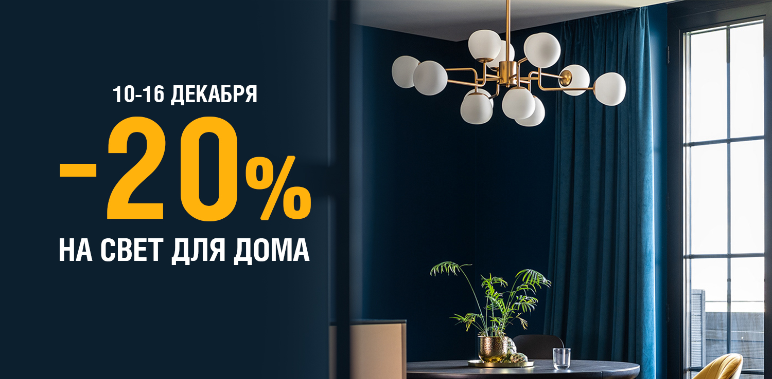 Распродажа света для дома в сети ДомоСтрой! С 10 по 16 декабря при заказе на сайте — скидка 20% на освещение для дома. Это отличная возможность обновить люстру, бра или светильники по привлекательным ценам!