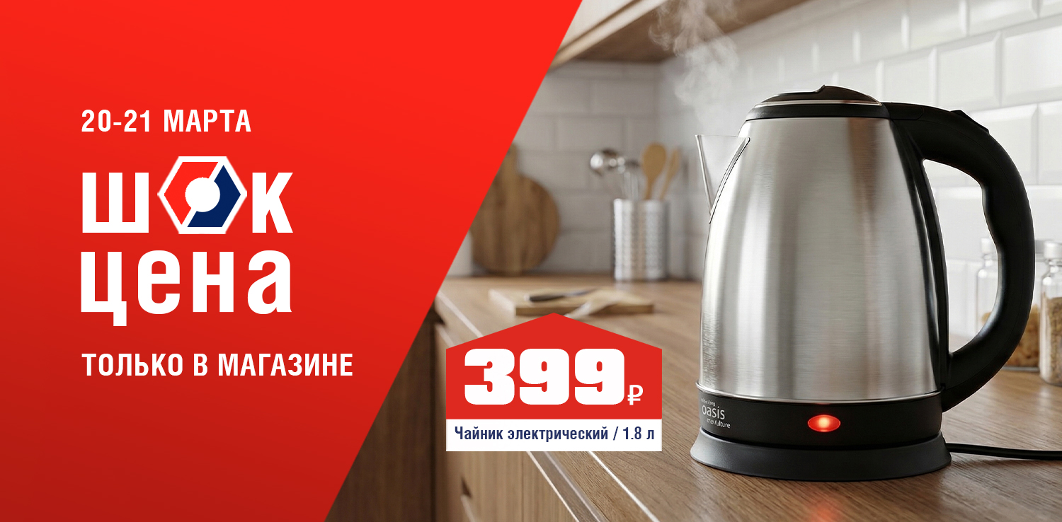 Цените каждую минуту? Этот чайник создан для вас! Мощность 2000 Вт и корпус из нержавеющей стали обеспечивают быстрое кипячение и долгий срок службы. Функция автоматического отключения гарантирует безопасность, а компактный объем идеально подходит для ежедневного использования. 20 и 21 марта в розничных магазинах ДомоСтрой не пропустите ШОК-цену: